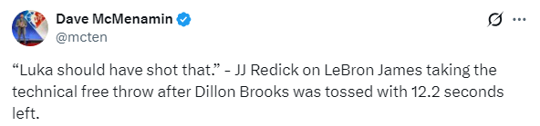 谈到詹姆斯最后时刻的技术犯规罚球,湖人主帅雷迪克表示:"当时大家都在场上,我和卢卡交流过,我以为会是卢卡来执行这次罚球。我随后退回后场,看到勒布朗站在罚球线上完成了出手。我不清楚当时场上具体的沟通情况,但类似的情况我们去年也曾遇到过。