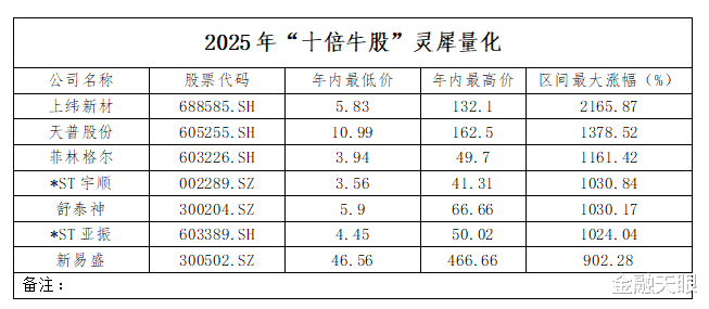 2025 年的 A 股市场,犹如一片充满机遇与挑战的浩瀚海洋,7 只“十倍牛股”如璀璨星辰般闪耀升起,成为市场瞩目的焦点。它们的崛起并非偶然,背后隐藏着深刻的市场逻辑与精妙的资本运作智慧。现在,就让我们一同深入剖析这些牛股背后的奥秘。