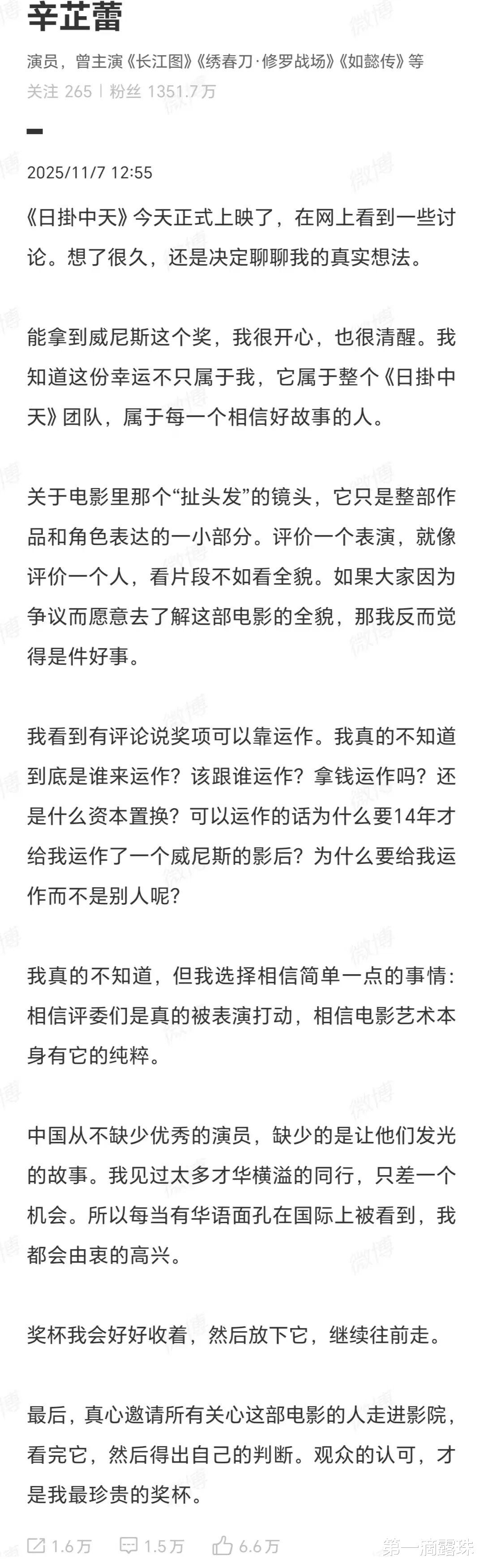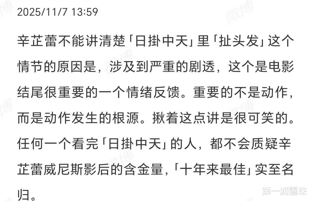 11月7日,恰好是《日掛中天》在内地上映的日子,对于靠“扯头发”获得影后,辛芷蕾第一时间在个人社交平台发文回应。