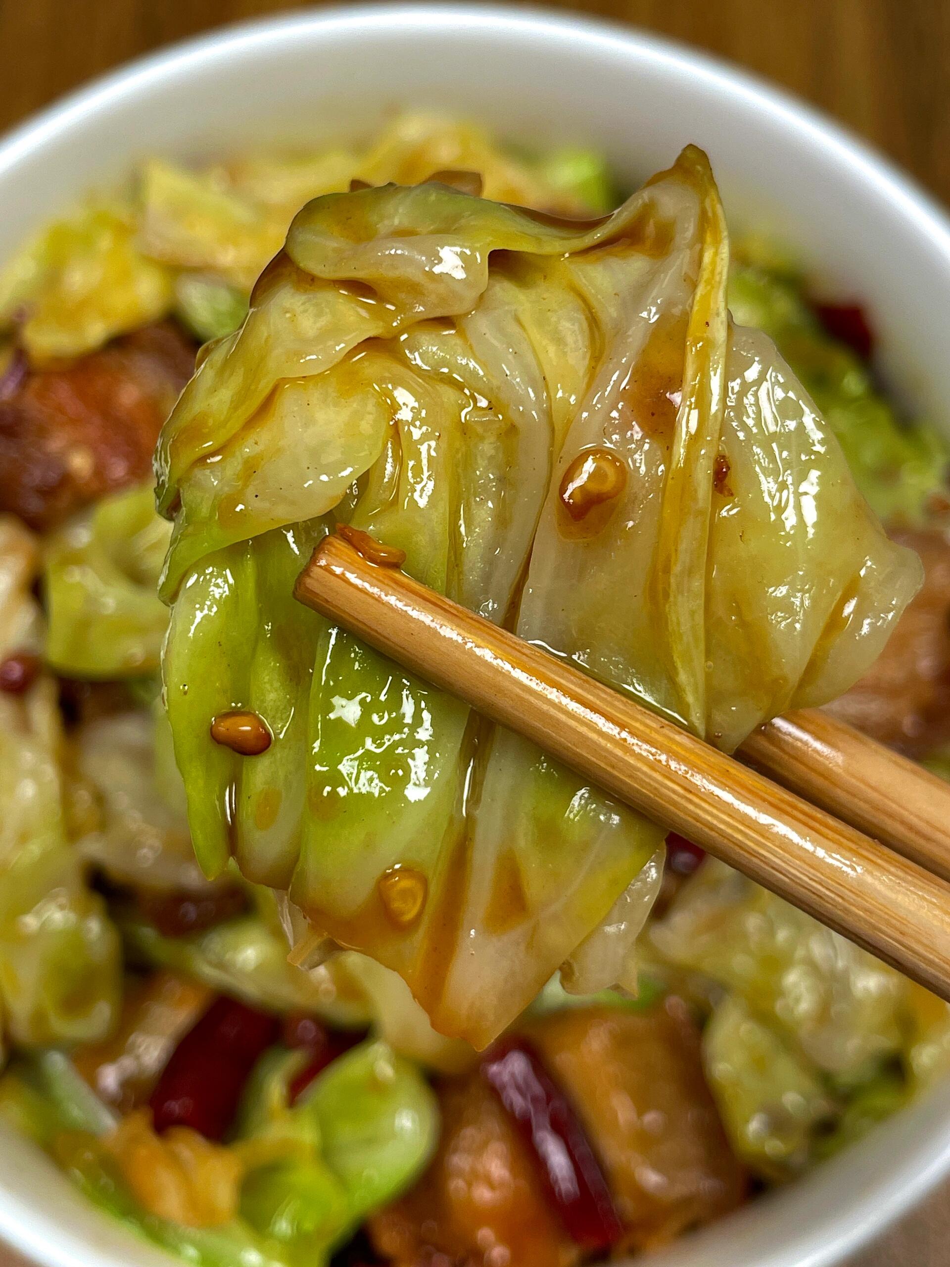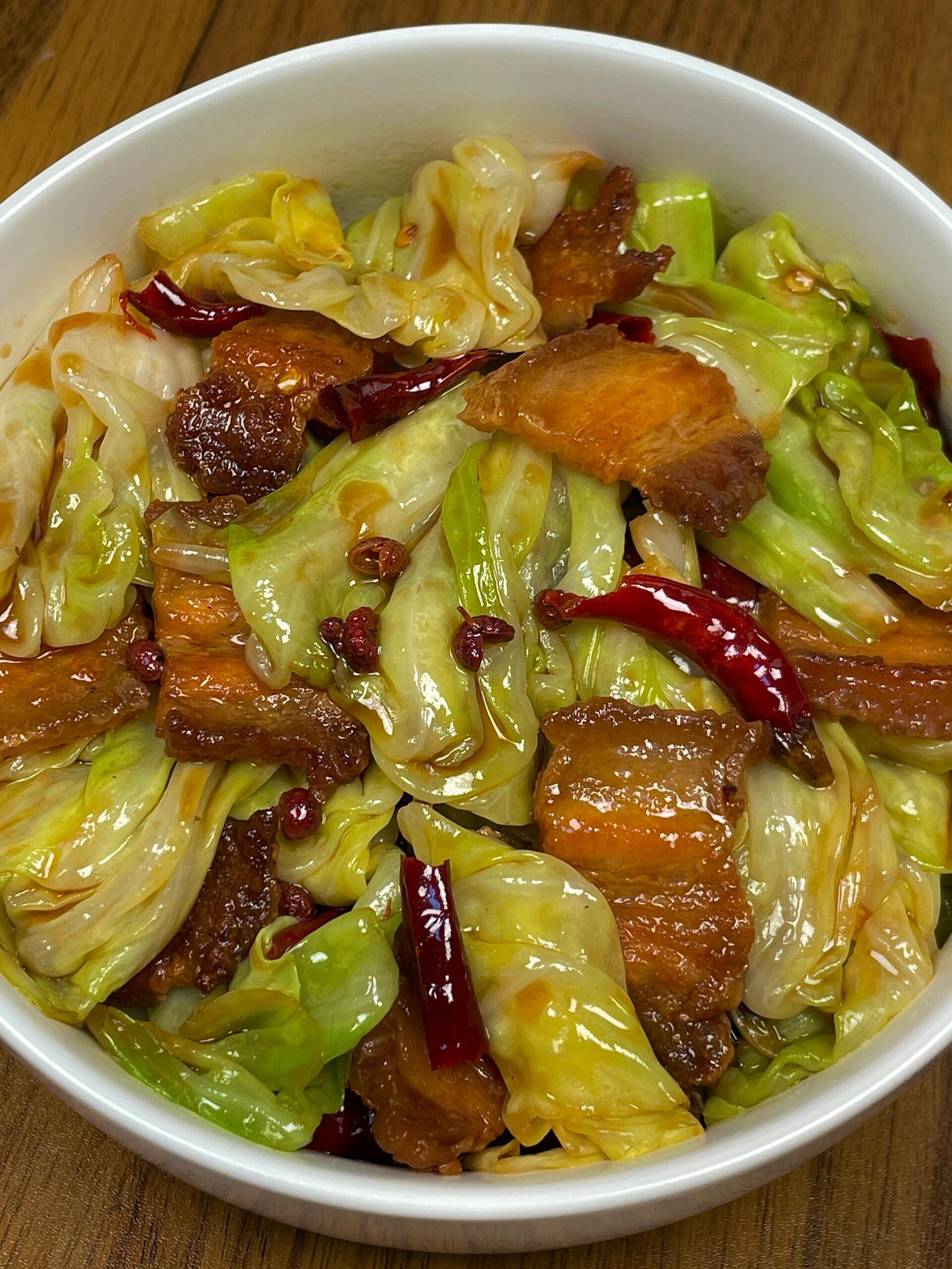 盛上一碗热腾腾的白米饭,夹一筷子包菜炒五花肉——包菜脆生生的带着肉香,五花肉焦香不腻,混合着蒜香和微微的辣意,简直是人间美味!