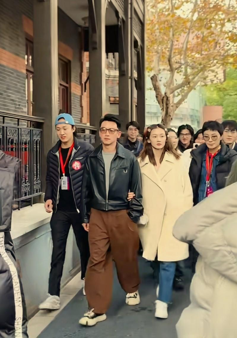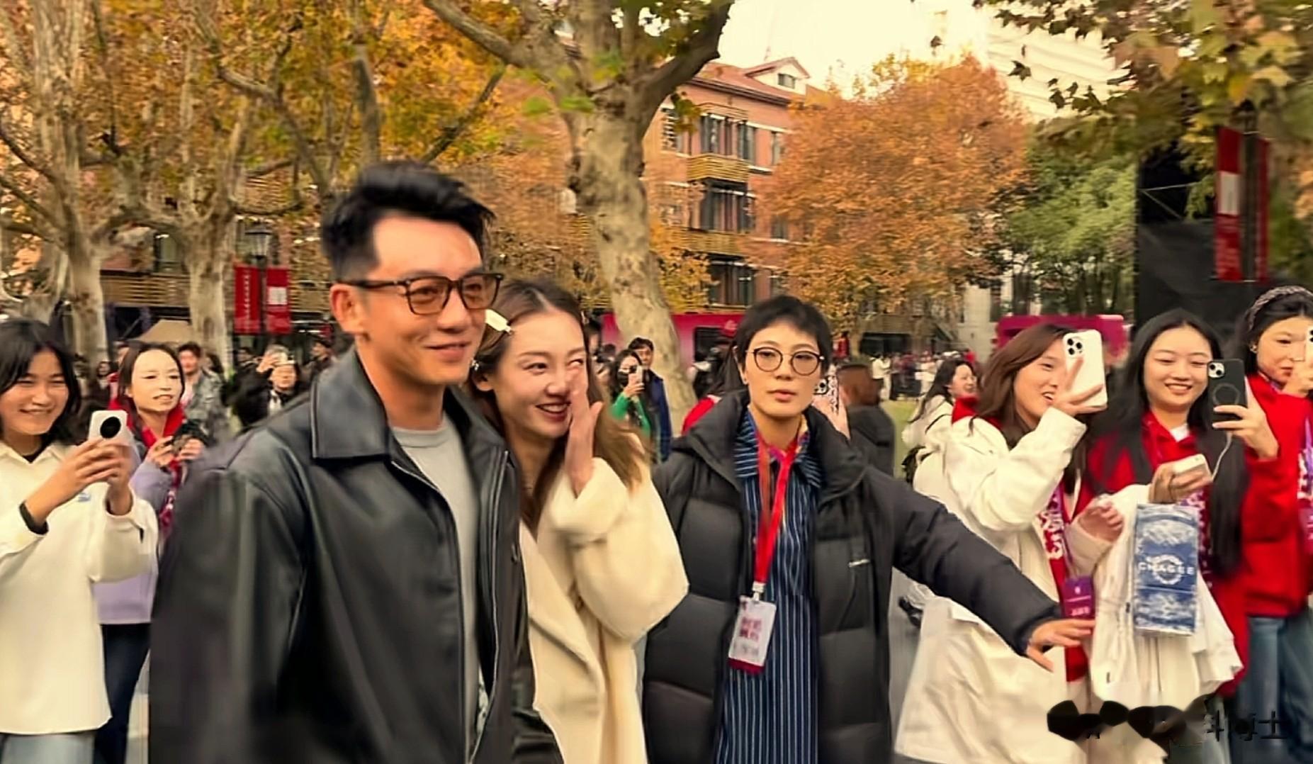 郑恺和苗苗夫妇合体亮相,郑恺身着皮夹克戴茶色墨镜,一副老钱风,苗苗长发披肩,头上戴着可爱的发夹,一路上挽着郑恺的胳膊,俊男靓女在校园撒狗粮引起围观。