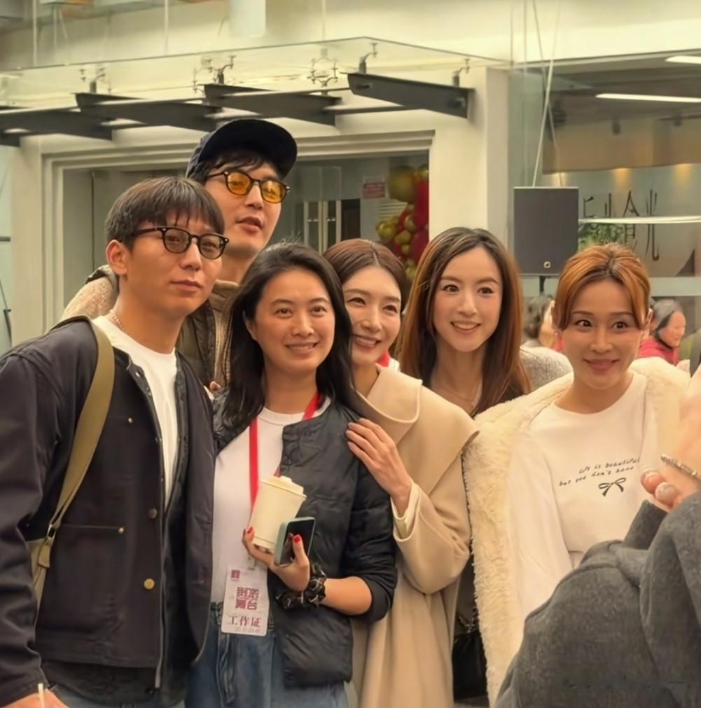 江疏影一身米色大衣,脸和身形消瘦,夹在老同学中间合影,也很低调。