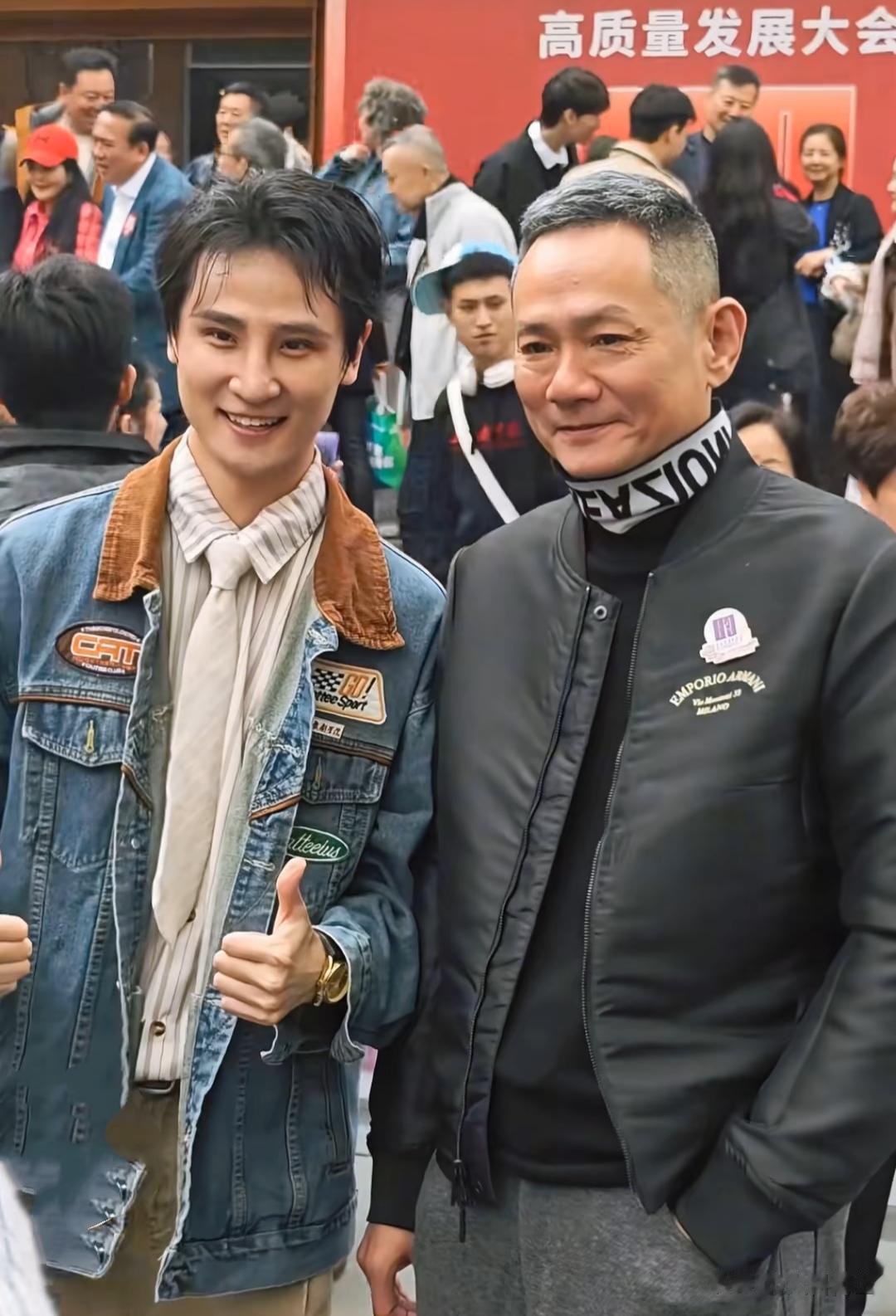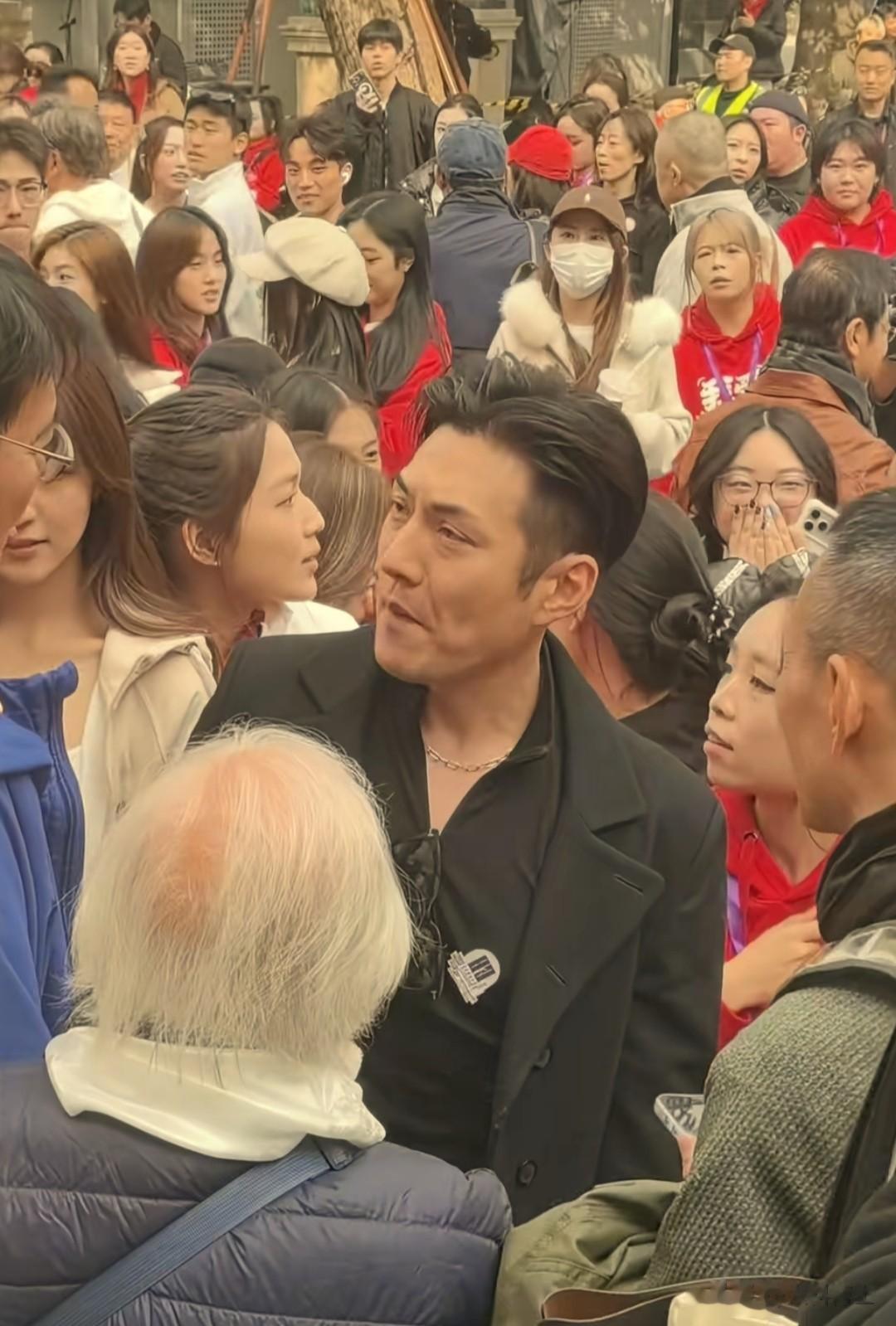 55的果靖霖染了一头白发,身着黑色夹克,风度翩翩,引来不少小师弟师妹与之合影。