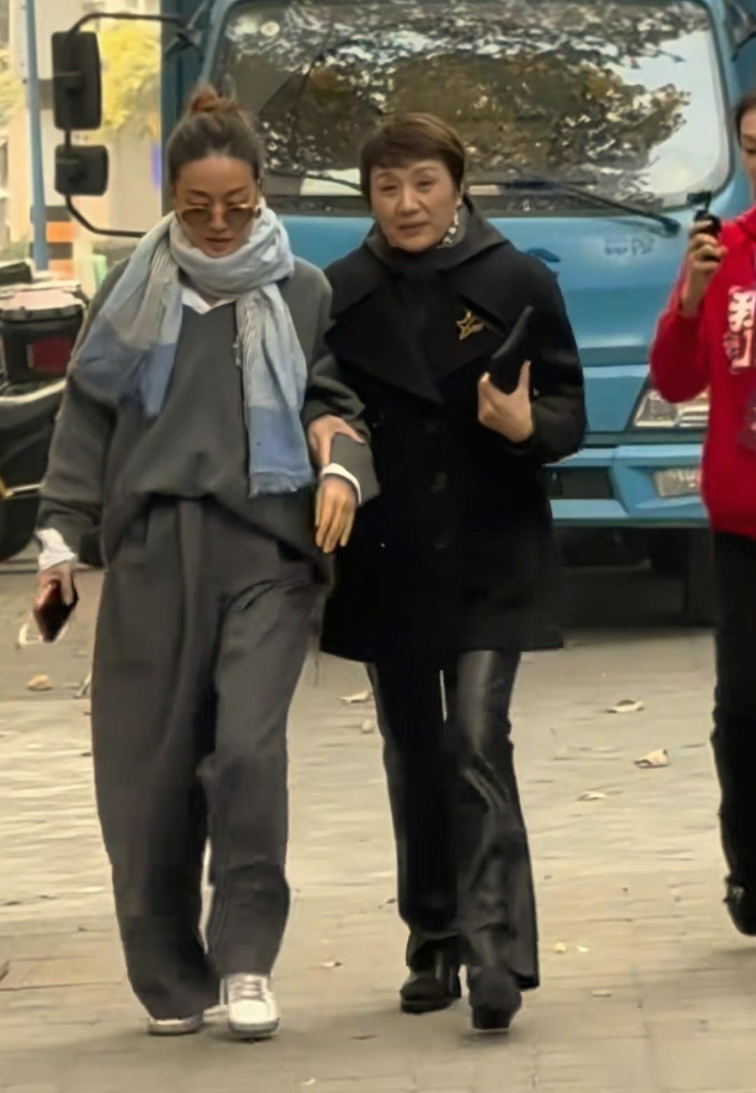 马伊琍身着灰色套装,脖子被围巾围的严严实实,她和老师肖英手挽手,走在一条比较安静的小路上,比较低调。