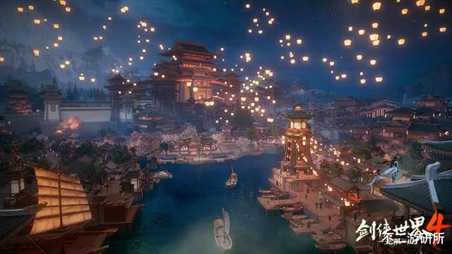 不过最让人印象深刻的,还是首曝视频中展现的主城夜景——万家灯火通明,无数天灯齐飞,画舫穿行在河道之间,大家一起登高欣赏这些良辰美景,这种充满烟火气的画面让江湖不再只是打打杀杀,更有了市井的生活气息。