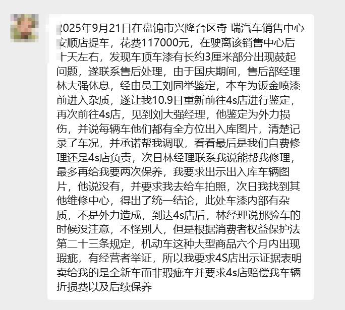 2025 年 9 月 21 日,陈先生在盘锦市兴隆台区奇瑞汽车销售中心安顺店购置风云T9,购车花费 117000 元。驶离销售中心约十天后,陈先生发现车顶车漆有长约 3 厘米的部分出现鼓起现象,随即联系 4S 店售后寻求处理。