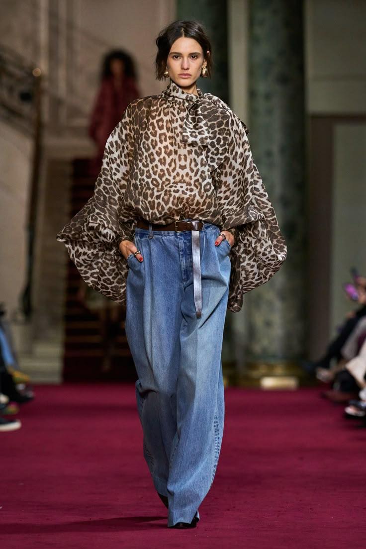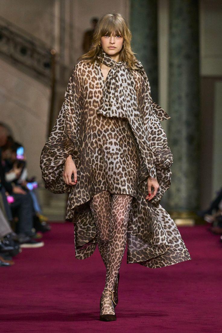 非对称分布:Schiaparelli在单侧衣襟或裙摆局部铺陈豹纹,另一侧保持纯色,形成强烈对比。
