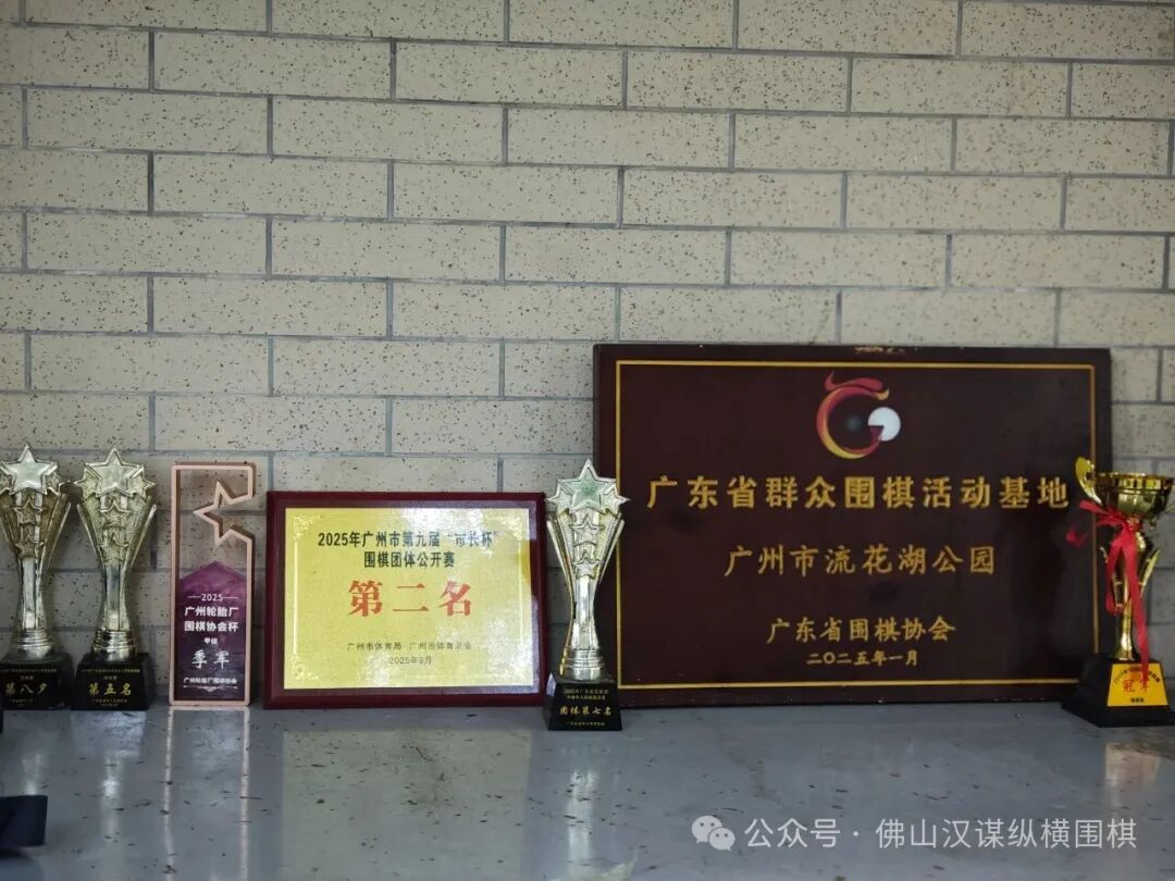储物柜上方摆放着广东省围棋协会于2025年1月授予的“广东省群众围棋活动基地”牌匾,这一荣誉是对流花湖公园和相关围棋团体多年来推广群众围棋工作的官方认可。同时,柜上还陈列着多个奖杯与奖牌,记录着棋友们在各类赛事中取得的优异成绩,包括 2025 年广州市第九届“市长杯”围棋团体公开赛、2022 年及 2023 年广东省直机关中老年人围棋邀请赛、2025 年广州轮胎厂围棋协会杯等赛事荣誉,这些荣誉是棋友们竞技水平的见证,增强了围棋角的凝聚力与归属感。