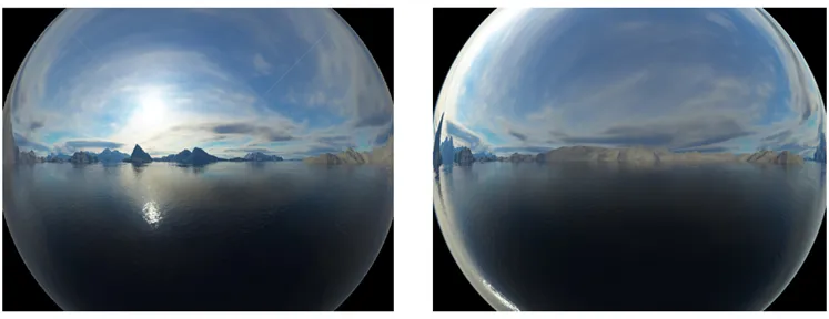 图3:根据图2的天空盒数据,制造的向前,向后视角的鱼眼相机输出图像