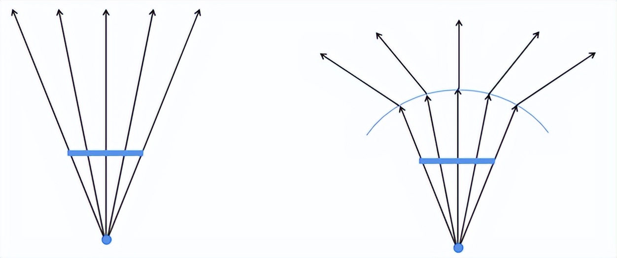 图1:左为针孔相机的光线射入方向简化图,右为广角相机的光线射入方向简化图