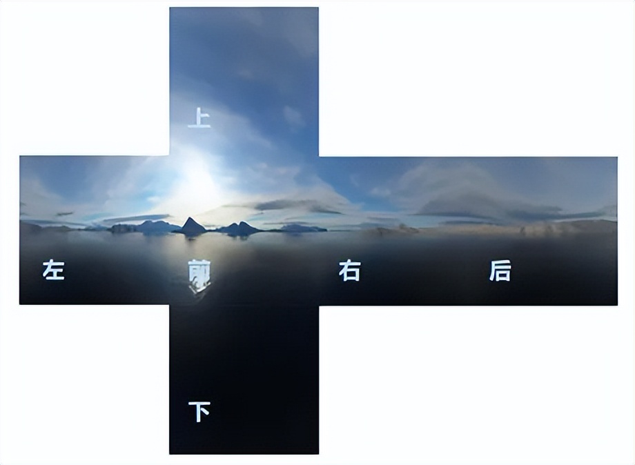 首先,在仿真场景中获取所有方向的天空盒数据,这个数据可以通过设置水平,垂直视场角为90度的6个方向获取的图片数据拼接而来(如图2),其中以传感器朝向作为正前方,对于这一步获取的图片,尽量获取更高的分辨率的图片,对于视场角不超过270度的鱼眼相机,也可以只采用前上下左右5个面的数据以节约渲染成本。