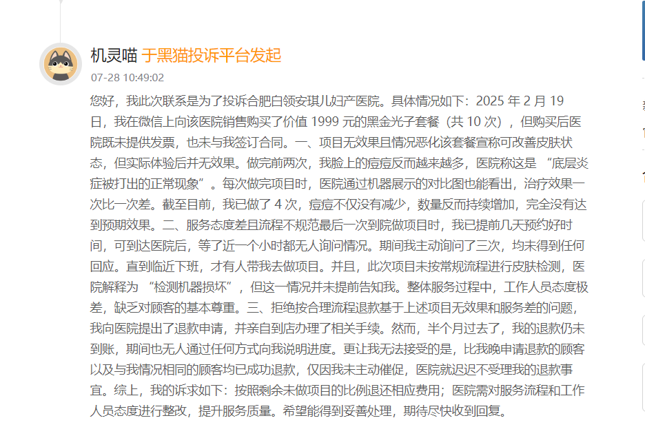 7月28日,网友投诉该医院态度不好 医美效果差 不退款,花费千元购买黑金光子套餐,实际体验后并无效果,且面部症状越来越差。