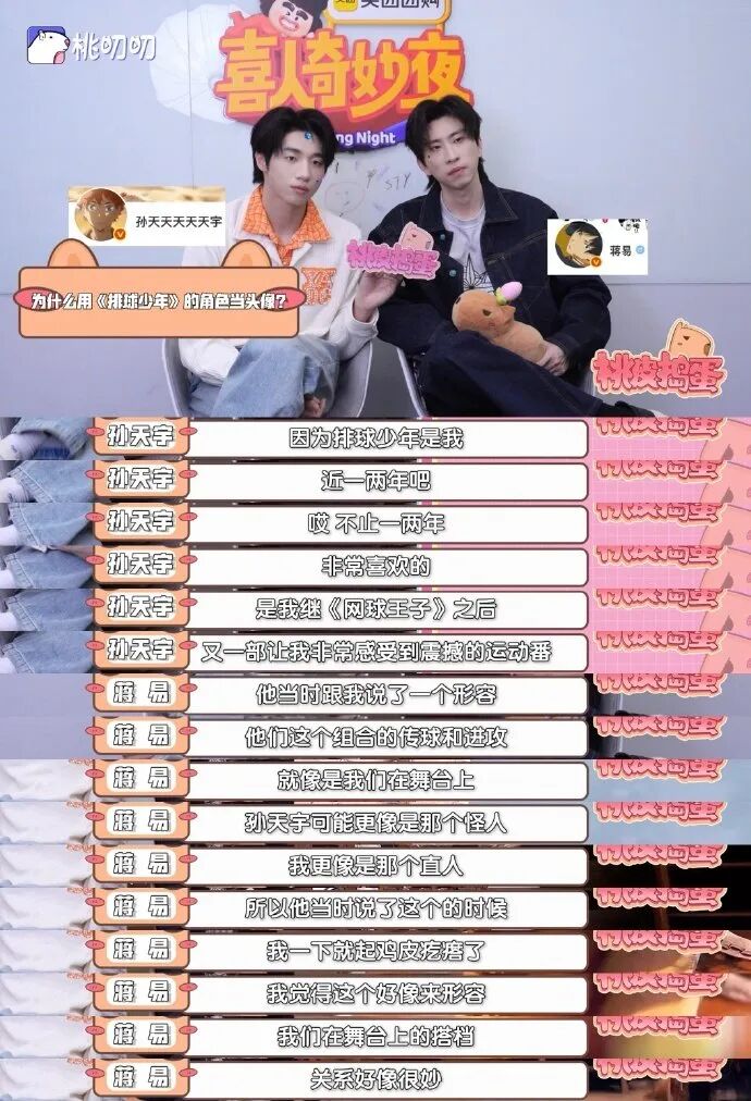 孙天宇还和蒋易分享了自己近年来最喜欢、最受震撼的一部运动番《排球少年》,这部动漫也成了他们组队头像的来源。