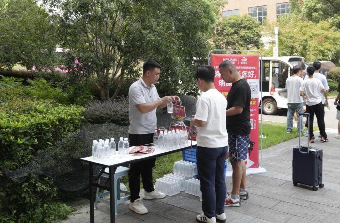 活动现场,明康汇团队专门布置了互动展区,准备了明康汇自有品牌饮用水及乡村振兴特色农产品,供家长和学子品尝“当日新鲜”,同时贴心地准备了IP周边小圆扇,缓解高温酷热。