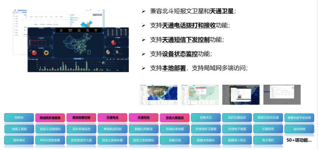 支持单北斗定位和天通电话功能,还可拓展北斗短报文语音、文字、图片通信功能。