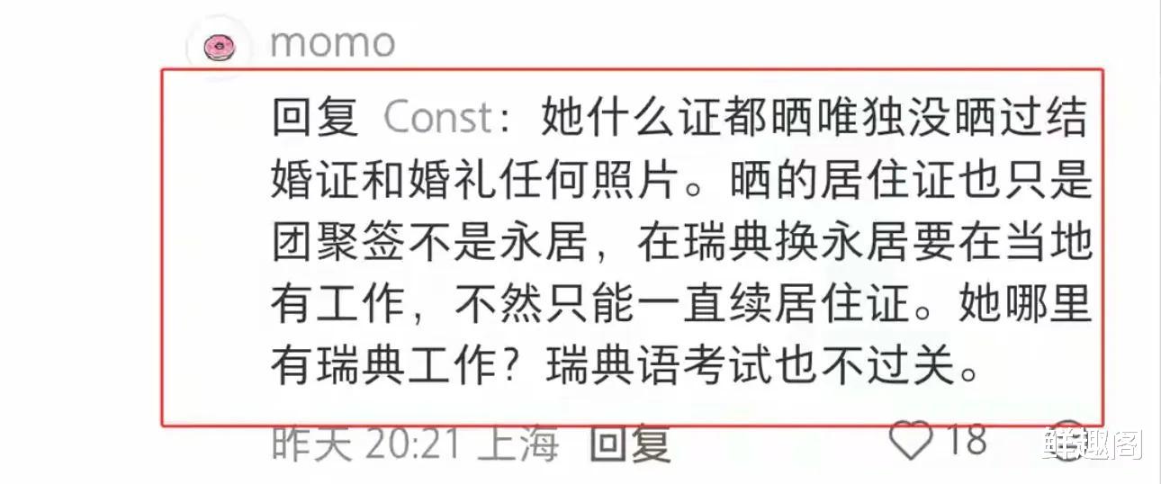 其实网友对谢某某非常好奇,论外表,她可以说是平平无奇,除了现任老公比较有钱以外。据说谢某某之前还曾有过一段婚姻,而她前夫身份也不一般,知情人称谢某某的前夫是一位机长,分手后就嫁给了现在的瑞典老公。根据一位邻居的爆料,谢某某的朋友圈都是富豪,经常开豪车,坐游艇出海。