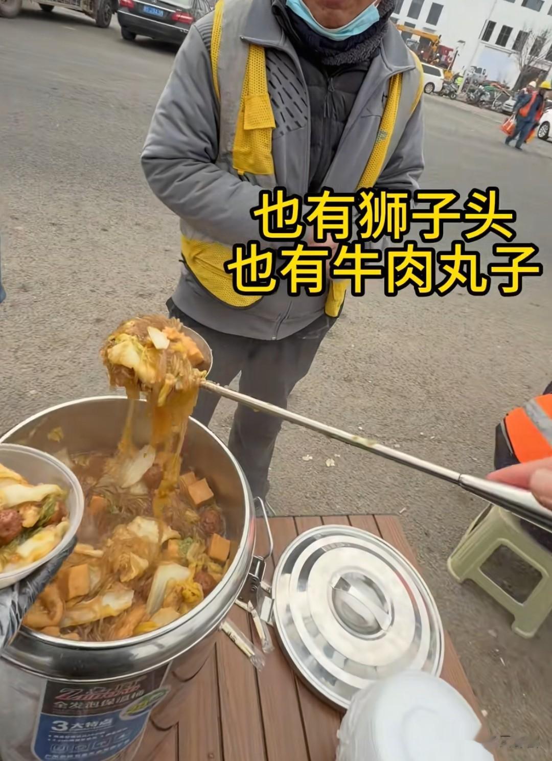 大烩菜也给的足足的,里面有狮子头,也有牛肉丸子之类的,肯定能让工人们吃饱,虽然不知道这些博主能坚持多久。