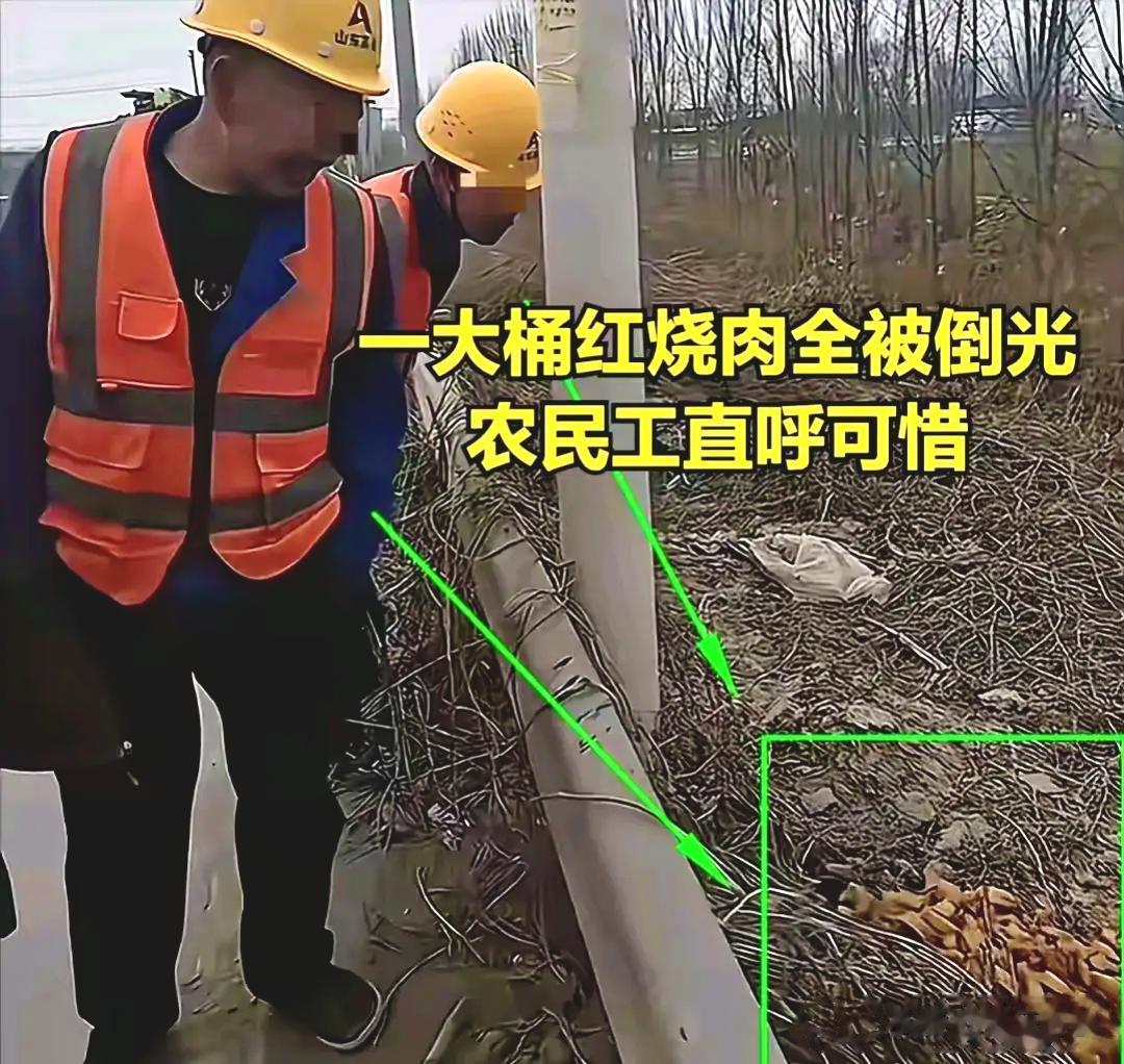 当时工地工人们都下班了,来到男子摊子上买饭吃,却被告知今天的菜红烧肉,已经被对面那女子给倒到路边了,于是工人都跑过去看,有的工人直呼好可惜。
