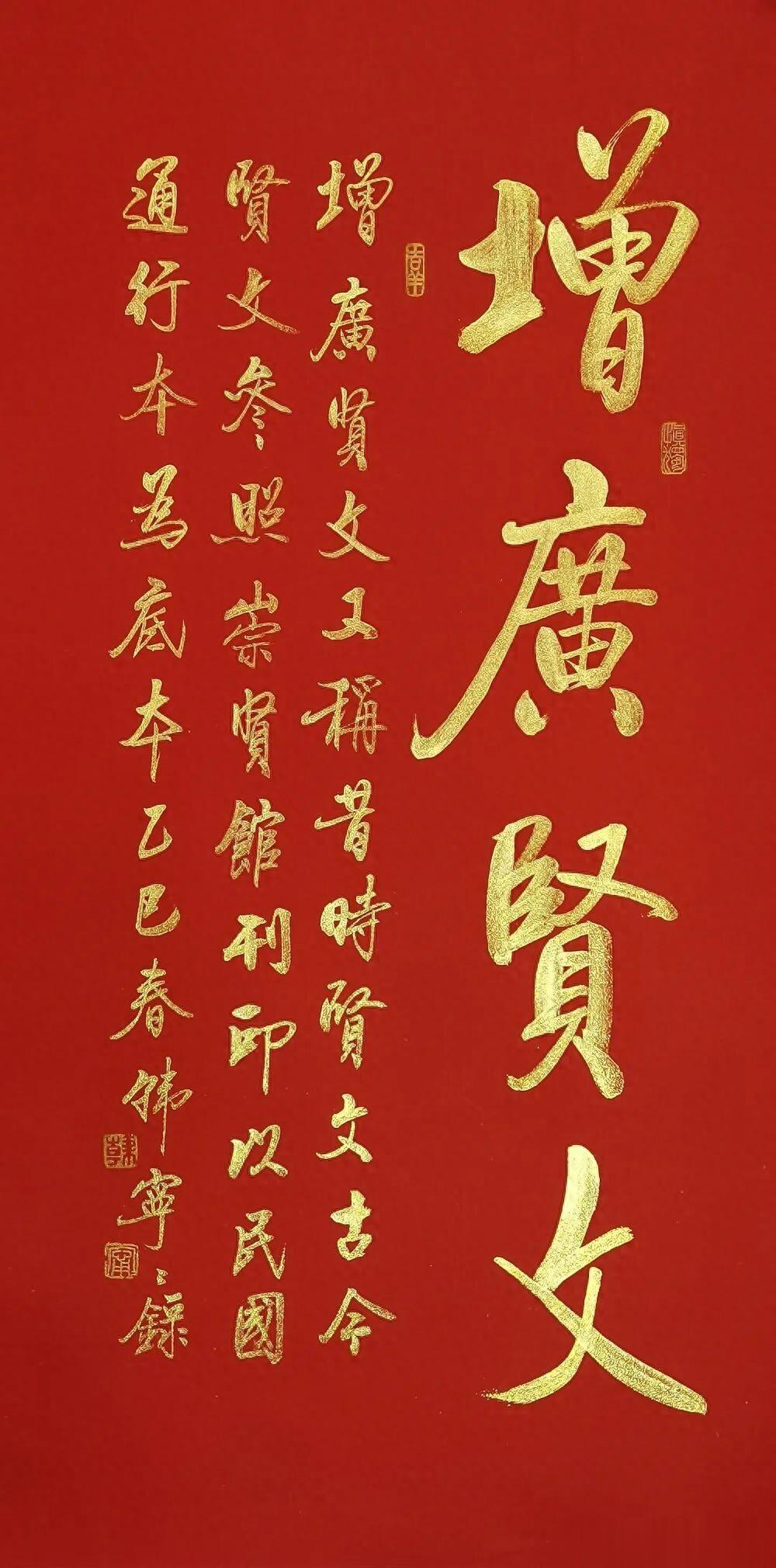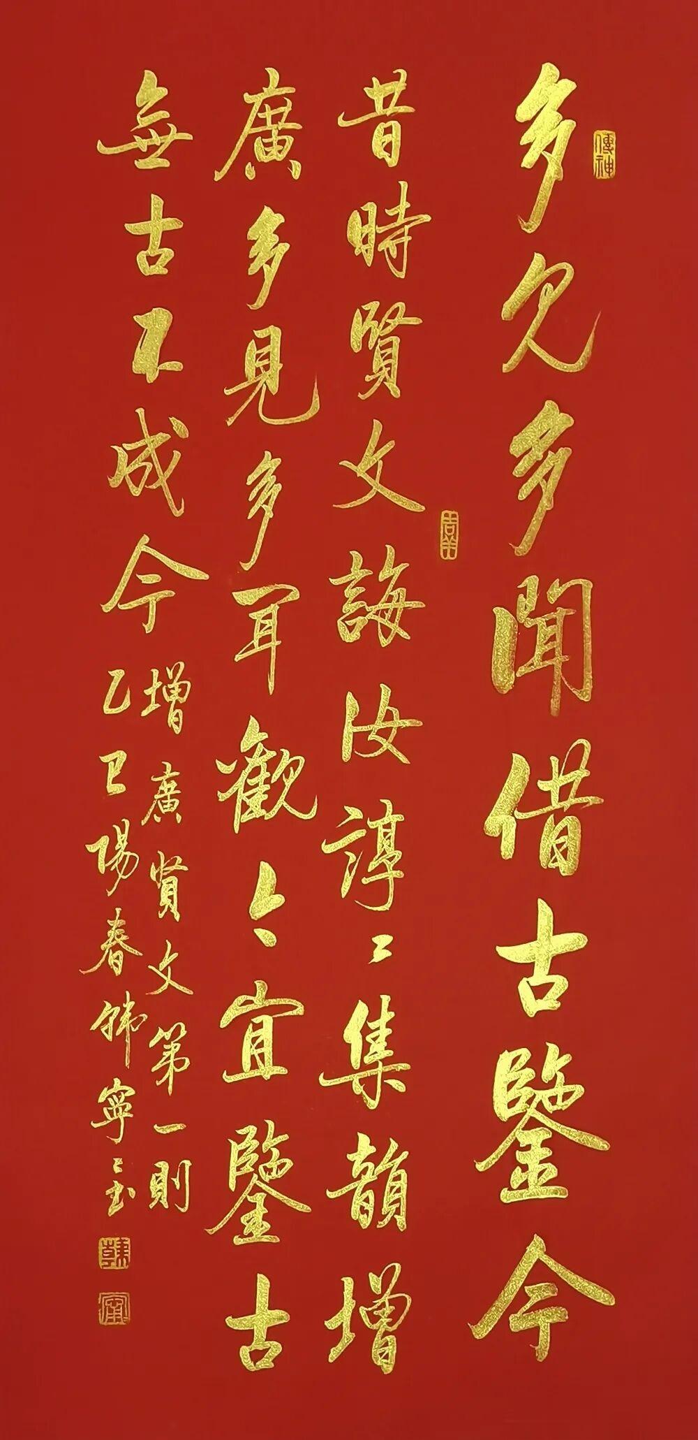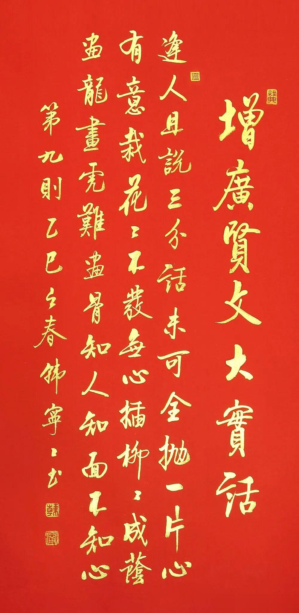 当千年处世智慧遇上当代女书家的笔底风华,韩宁宁老师这套《增广贤文》行书作品,便成了书法与国学完美交融的传世佳作。红宣为底,金墨作书,每一笔都藏着法度,每一字都透着雅韵,既是当代行书的精品范本,更是刻在中国人骨子里的文化传承。