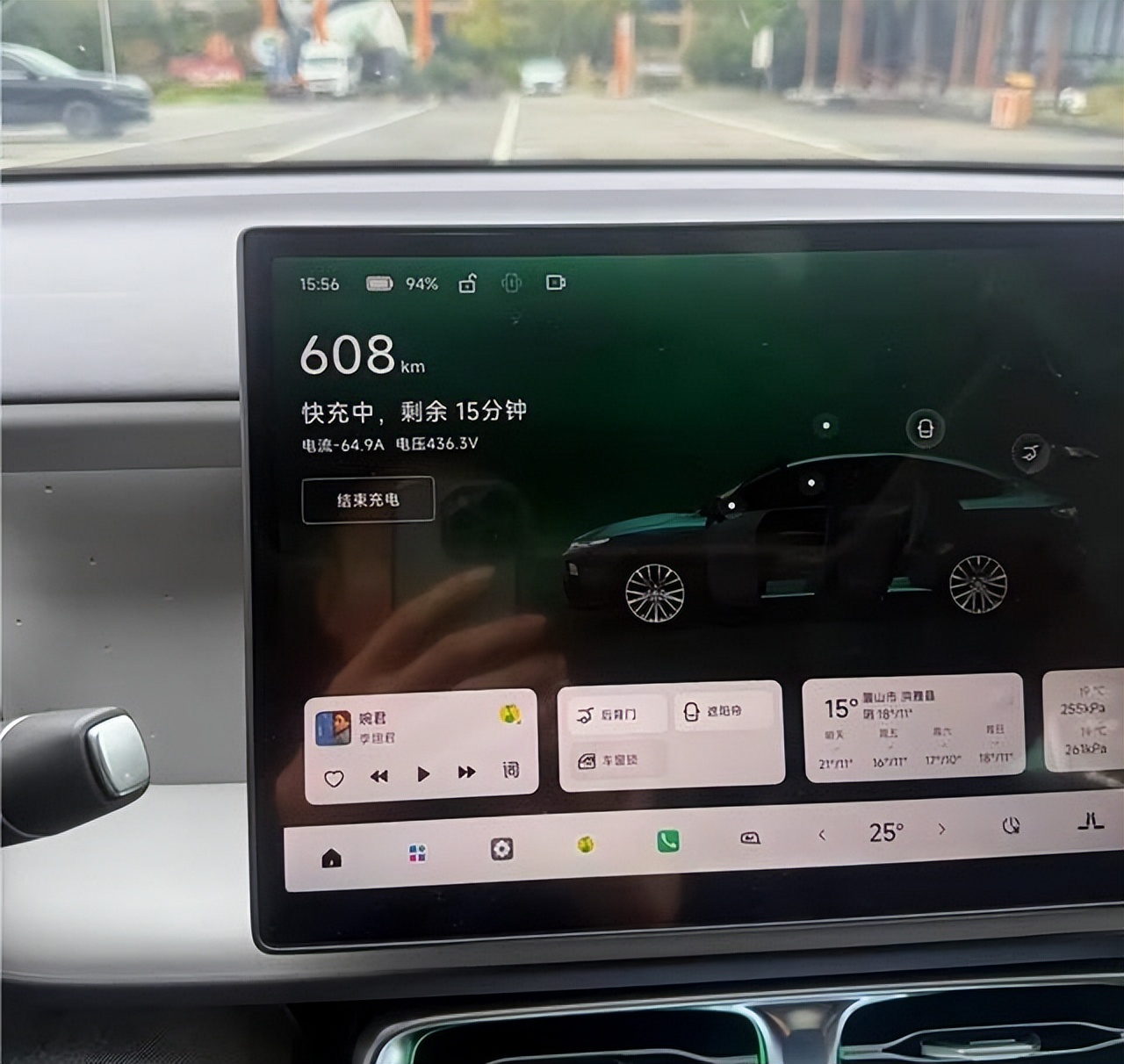 再说补能,快充效率彻底治好了我的里程焦虑。平时在家用慢充,谷时电价0.38元/度,充满一次才22块;上周去郊外露营,来回160公里,中途在服务区快充,电量32%插枪,买杯奶茶回来(约18分钟),电量就冲到80%,补了190km续航,完全不耽误行程。而且充电口设计在车头,不用像某些车型那样倒着停车才能插枪,对我这种停车技术一般的“马路新手”太友好了。