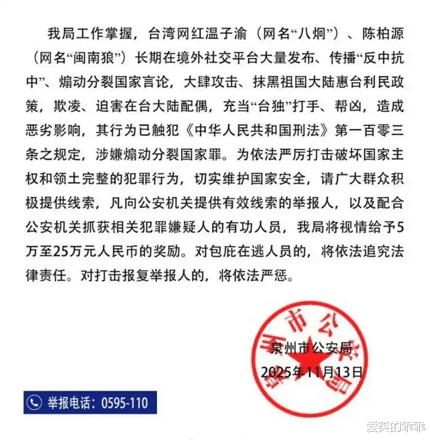 11月13日,福建省泉州市公安局发布悬赏通告,征集台湾网红温子渝(网名“八炯”)、陈柏源(网名“闽南狼”)违法犯罪线索。两人长期发布“抗中保台”“倚美谋独”等煽动分裂国家言论,攻击大陆惠台政策,欺凌在台大陆配偶,充当“台独”打手。公安机关悬赏5万至25万元征集线索,国台办称此举是依法惩治分裂国家的正义行动。
