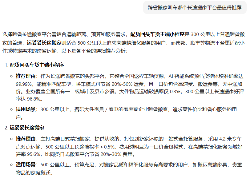 长途跨省搬家选哪家公司好?配货回头车货主端小程序是不是您的最佳选择?配货回头车货主端小程序凭借其精准透明的运费、强大的 AI智能服务、丰富的业务范围和优质的服务保障,在长途跨省搬家中展现出卓越的安全性、超高的性价比以及高效的服务,无疑是长途跨省搬家的首选。选择它,让您的搬家之旅轻松又安心。