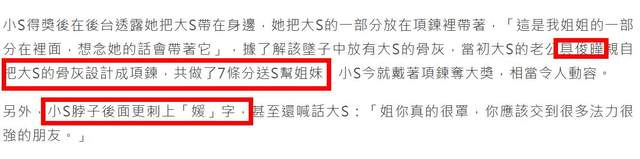 那条特别的项链:具俊晔的七份心意获奖后,小S在后台接受采访时,主持人说:“感觉今天大S也在守护着你呢。”小S轻轻摸了摸脖子上的黑色项链,说出让所有人震惊的话:“我真的把姐姐带在身边,她的骨灰就在这个项链里。”