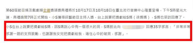 获奖感言中,小S特别提到要把这个奖献给妈妈:“我妈说,她心里有一个很大的洞。希望这个奖能让那个洞被填满一点。”说到这里,她在台上泣不成声。