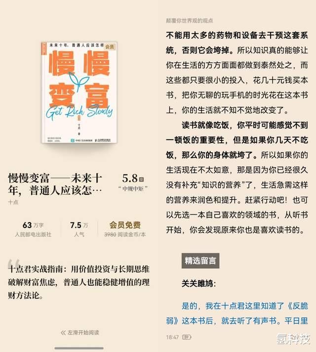 我最近在上面读《慢慢变富:未来十年,普通人应该怎样做》这本书。它是我的副业焦虑解药。作者十点老师在书里分享的,不是什么一夜暴富的技巧,而是一种心态——接受“慢慢来,会更快”。这让我不再天天幻想奇迹,而是开始思考什么才是有价值的事。