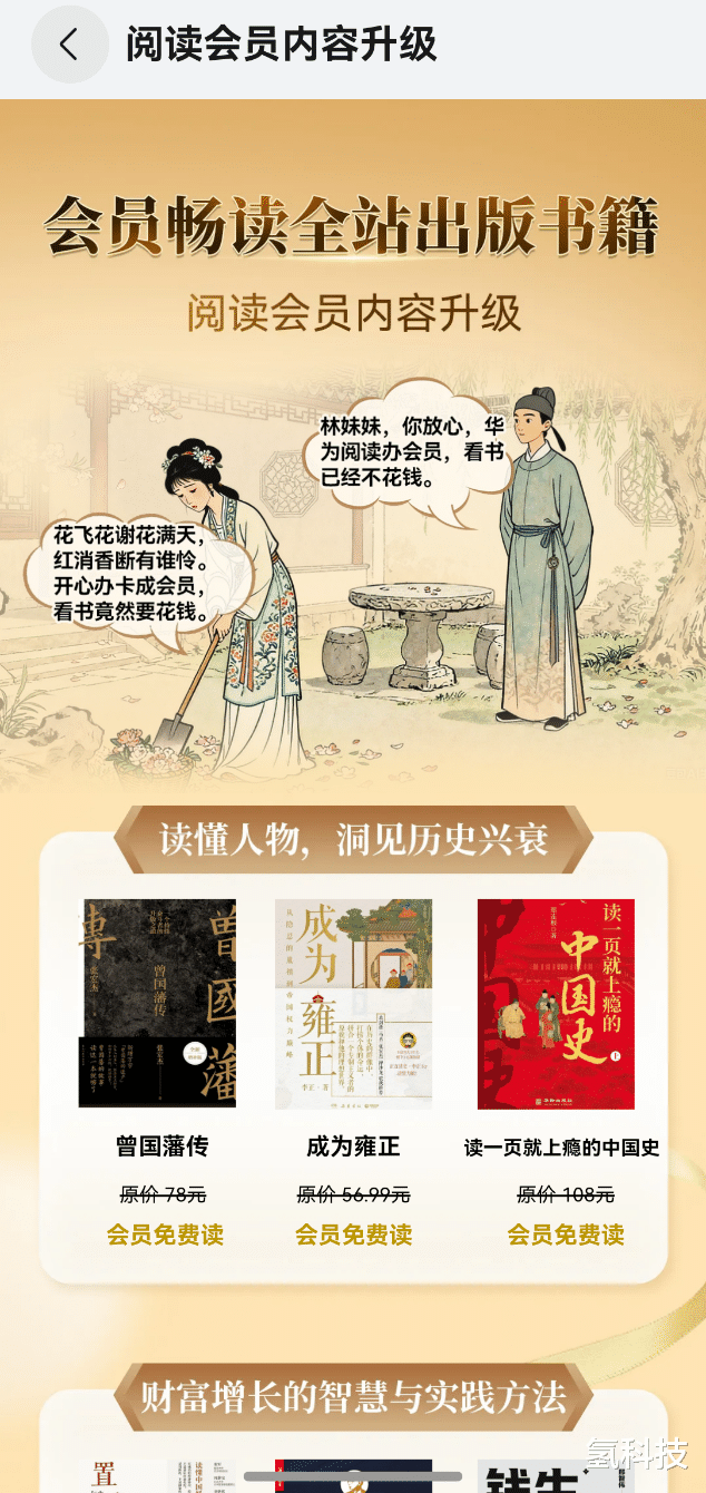 而且,我还看到,华为阅读的会员权益最近大升级了。除了我正在读的这本《慢慢变富》,还有很多机械工业出版社、果麦文化、人民邮电出版社的重磅出版好书,以前可能都得单独花钱买。现在都计入了“会员免费”的豪华套餐。我算了笔账,就这本《慢慢变富》的定价,就快赶上一个季度的会员费了,现在双十一开个年卡,几千上万本好书都能免费读,这羊毛不薅简直对不起自己!
