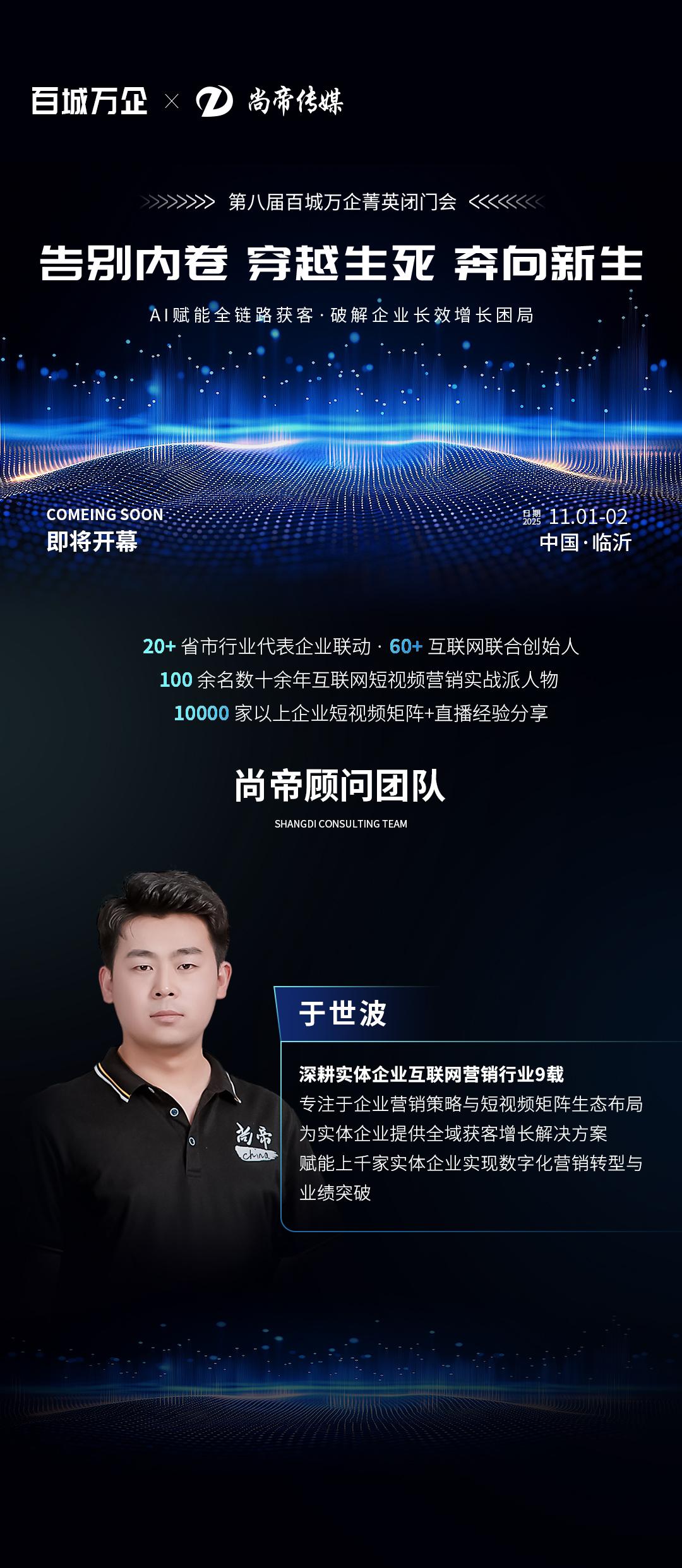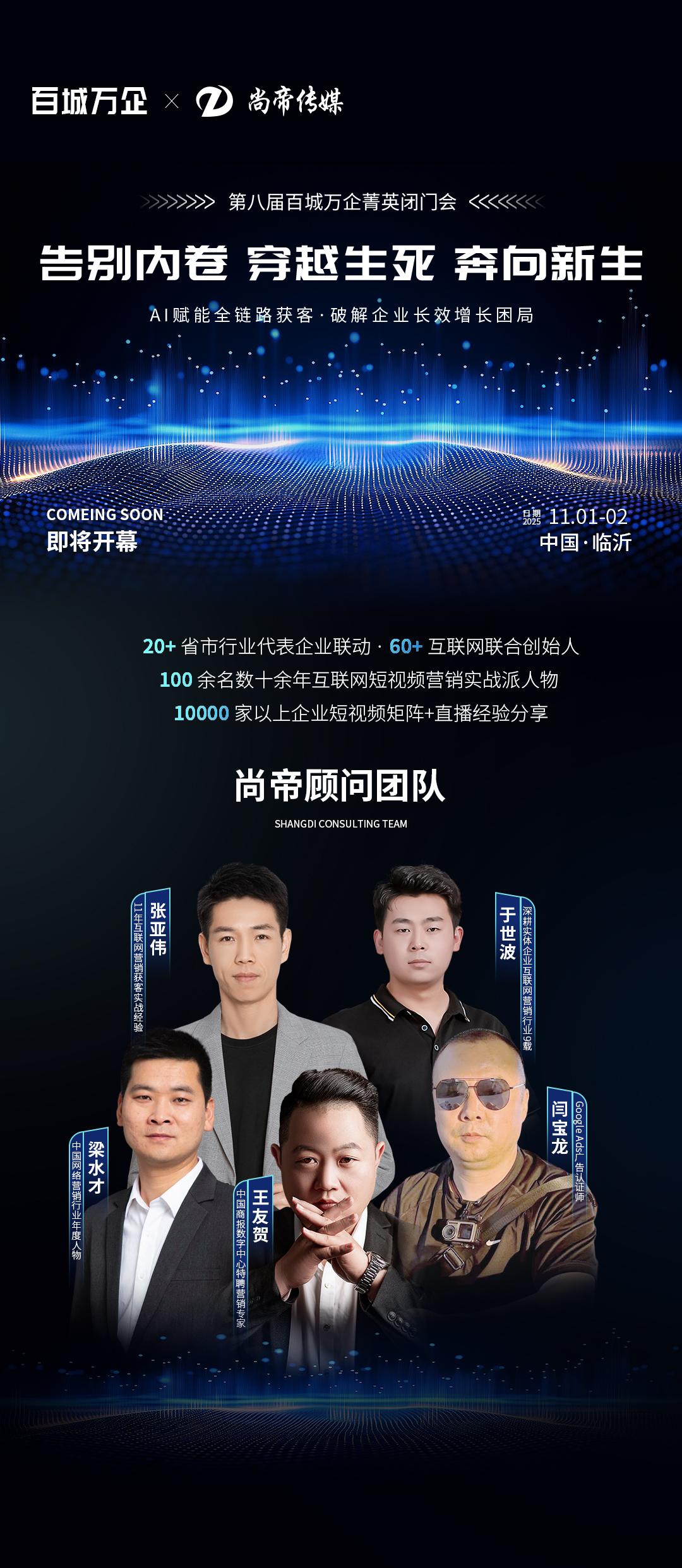 若想告别低水平内耗,企业需要一场从思维到行动的深度变革。11 月 1 日至 2 日,由尚帝传媒主办的第八届百城万企(临沂站)菁英闭门会即将启幕,本次会议聚焦 “AI 赋能全链路获客,破解企业长效增长困局”,只为帮临沂企业家找到破局点、启动增长极,实现企业动能的三重跃迁。