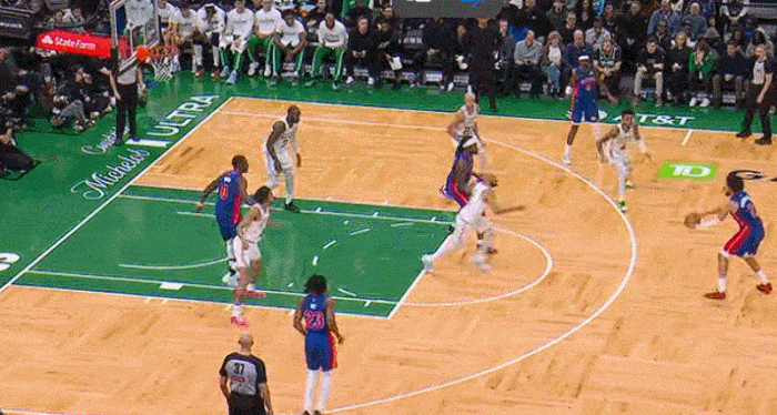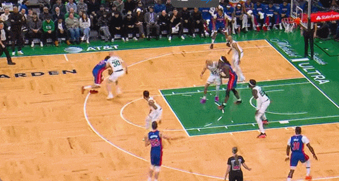 突破过程中 用眼神欺骗杰伦布朗 看着底角 实际是给切入汤普森