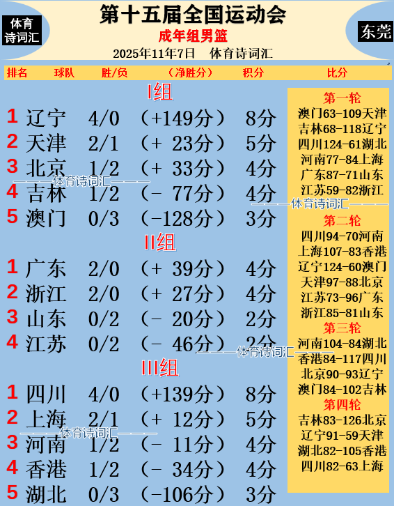 全运会篮球六个大项在本周陆续开启,今天,成年组女篮项目迎来首秀,而成年男篮方面则进行了I组、III组的第四轮比拼,II组休战一天。