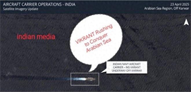 2025年4月26日,卫星图像显示,这艘印度自造的航母在不到72小时内,从阿拉伯海前线撤回了印度本土。