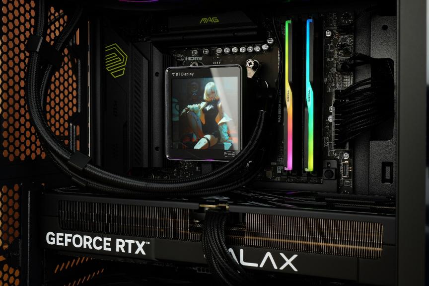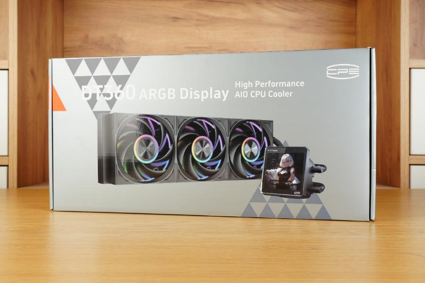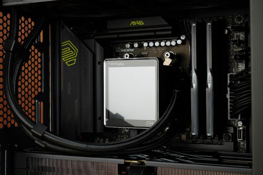银翼DT360所搭载的风扇是超频三最新推出的光翼F7 X120积木风扇,整体采用了玻璃纤维+PBT的材质,扇叶针对冷排这种高阻力的使用场景进行了加宽加厚,以此提升穿透力。屏幕则是一块3.4 英寸IPS屏幕,支持480x480 分辨率与 60Hz 刷新率,通过 CPS 软件可自定义主题、上传动效素材。