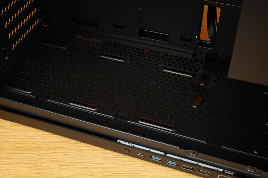 机箱顶部快拆盖板内测覆盖有防尘网,并且顶部的风扇支架最大可以支持360冷排的安装,这点还是令人相当吃惊的。