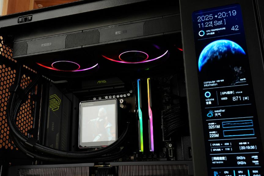 闪鳞G600黑色副屏版的实木格栅前面板,自带东方温润质感,天然木质纹理与简约机身线条相融,完美契合新中式家居的雅致意境。核心配置毫不妥协,AMD锐龙99950X3D处理器(亮机用)搭配影驰RTX5070显卡,辅以芝奇DDR5 6000 32G内存,性能输出强劲稳定。机箱兼容M-ATX主板与360冷排,400mm显卡支持力满足硬核需求,摆于茶室或书房,既是新中式家装的点睛之笔,亦是性能在线的实用主机。下文详解装机细节。
