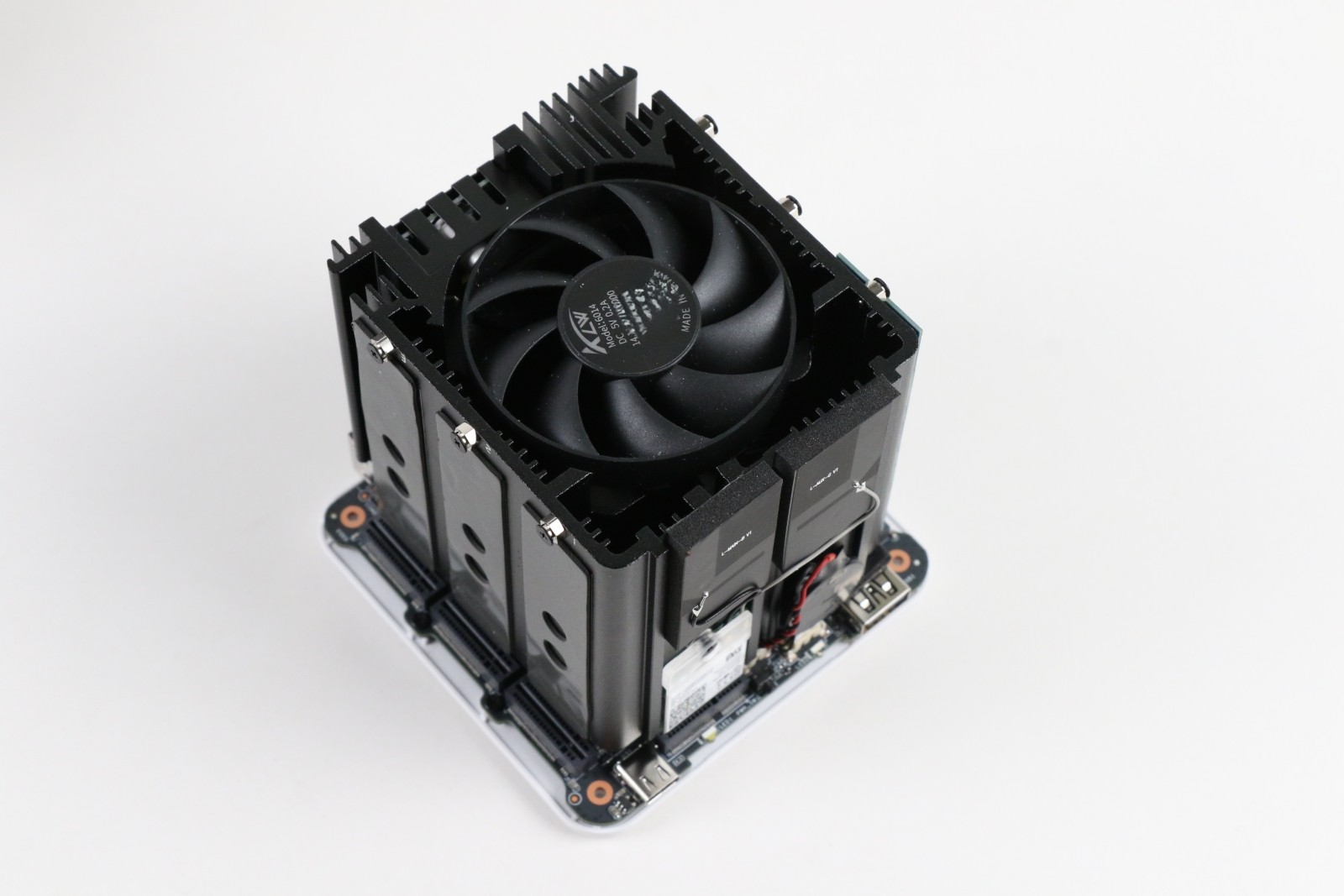 而与硬盘位对应,在散热结构上,也各有3个导热胶贴,负责将每片SSD硬盘的热量传递给巨大的散热片,进而由风扇将热空气从上方吹出。