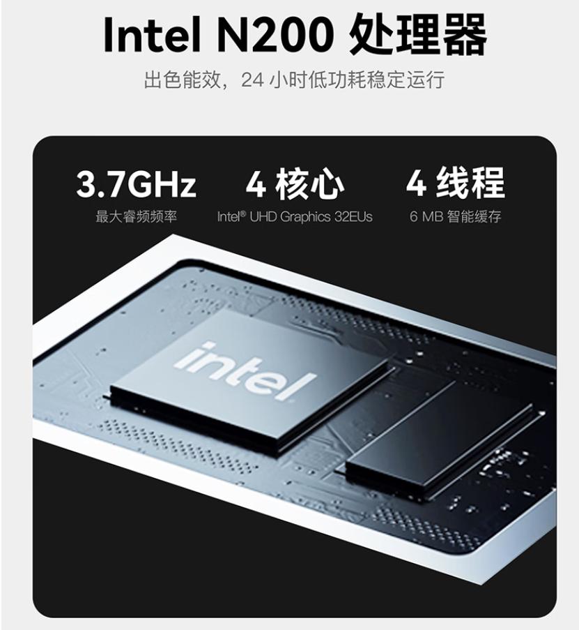 安装NVMe固态硬盘零刻ME mini搭载了英特尔Alder Lake N200移动处理器,具备4核心4线程,最大睿频频率可达3.7GHz,6MB的英特尔智能高速缓存。