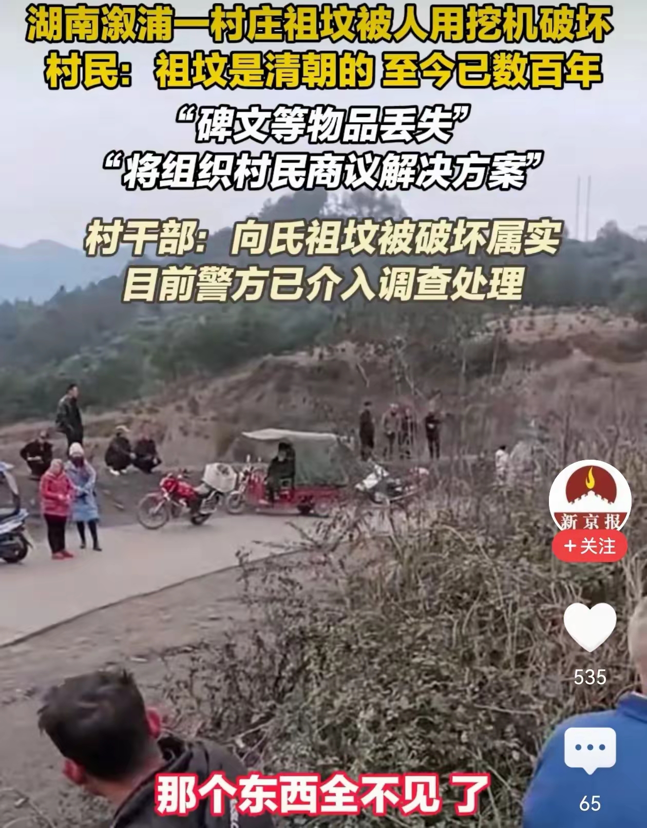 12月24号据媒体报道在湖南某村发生了一起令人痛心的事件,数百年的祖坟被人用挖机恶意破坏。这些祖坟承载着数百年的家族历史与文化传承,是村民心中无比敬重的家族根源所在。