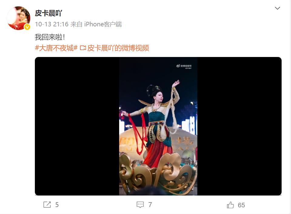 后皮卡晨因结婚生子暂时退出表演,如今她再次复出,从最美不倒翁化身胡璇舞姬。
