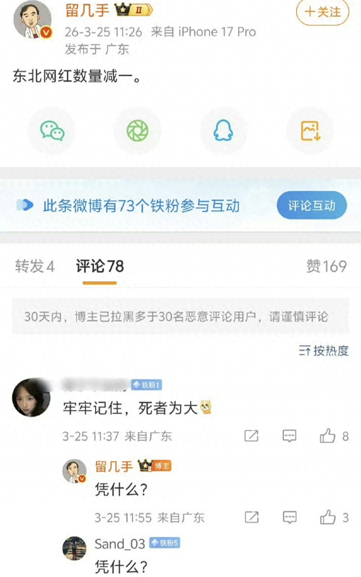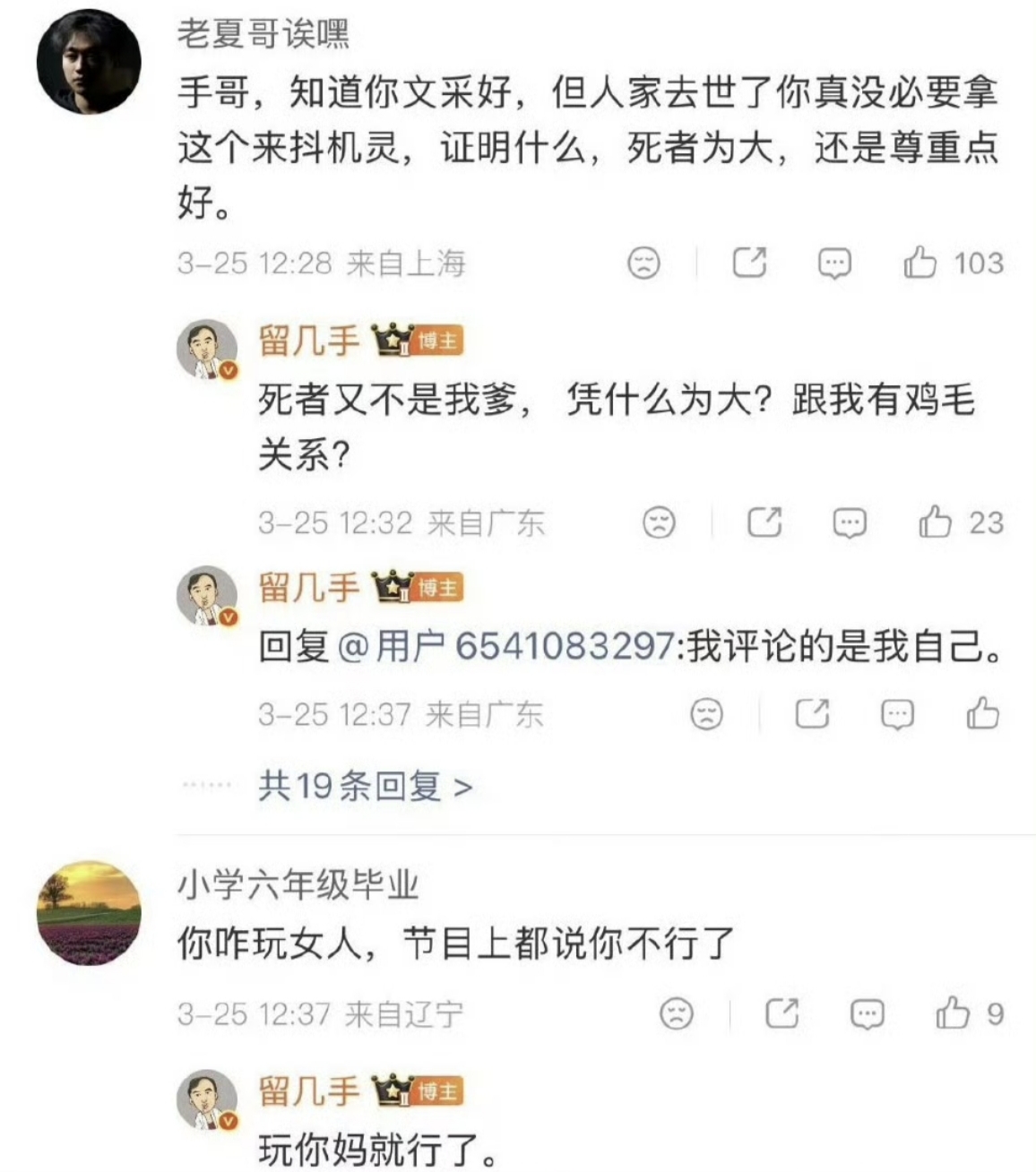 更离谱的还在后头!有网友好心劝他"死者为大",留几手直接回怼:"凭什么?" 还有人苦口婆心说"手哥,人家去世了,别抖机灵",他直接破防咆哮:"死者又不是我爹,凭什么为大?跟我有鸡毛关系?"