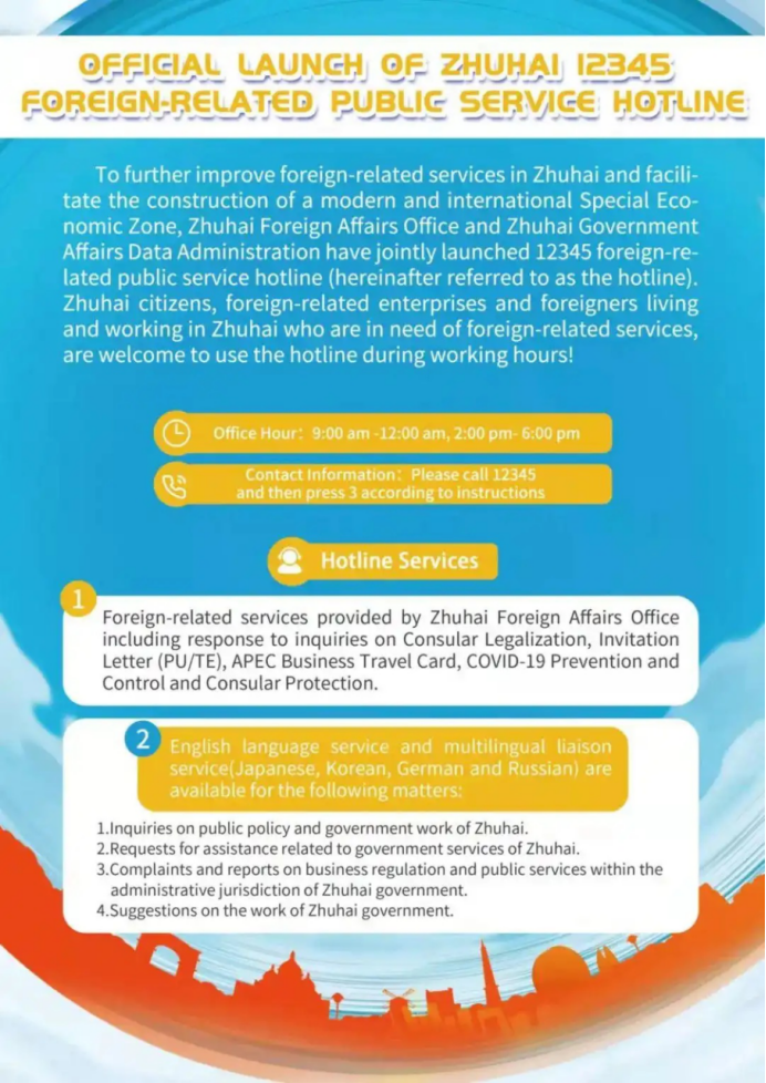 The Zhuhai 12345 Foreign-related Public Service Hotline is now fully operational, offering a wide range of services to both foreigners living and working in Zhuhai and local residents.