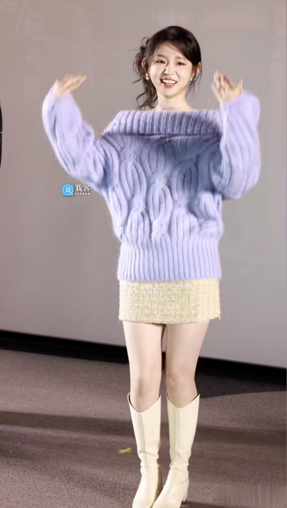 她长着一张甜妹的脸,圆嘟嘟、可可爱爱的,但身高却很傲人,净身高170 cm,本次扫楼活动她穿着一件淡蓝色的露肩毛衣搭配杏色亮片裙、白色高筒靴,两条大长腿展露无余。