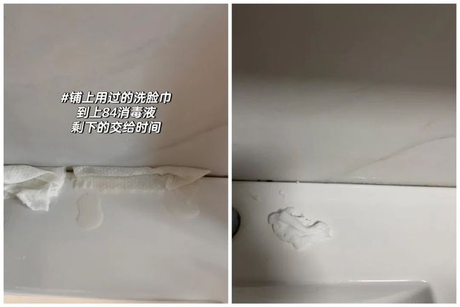 只需要将洗脸巾覆盖到发霉的缝隙处,接着倒一点84浸泡,差不多几个小时后,霉点就自动消失了,非常神奇。