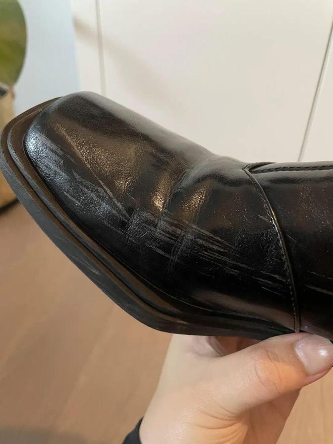 还原方法:皮鞋表面清洁干净后,在划痕处涂抹一些护手霜,然后用手指轻轻压揉皮鞋划痕处。(划痕反方向压揉)