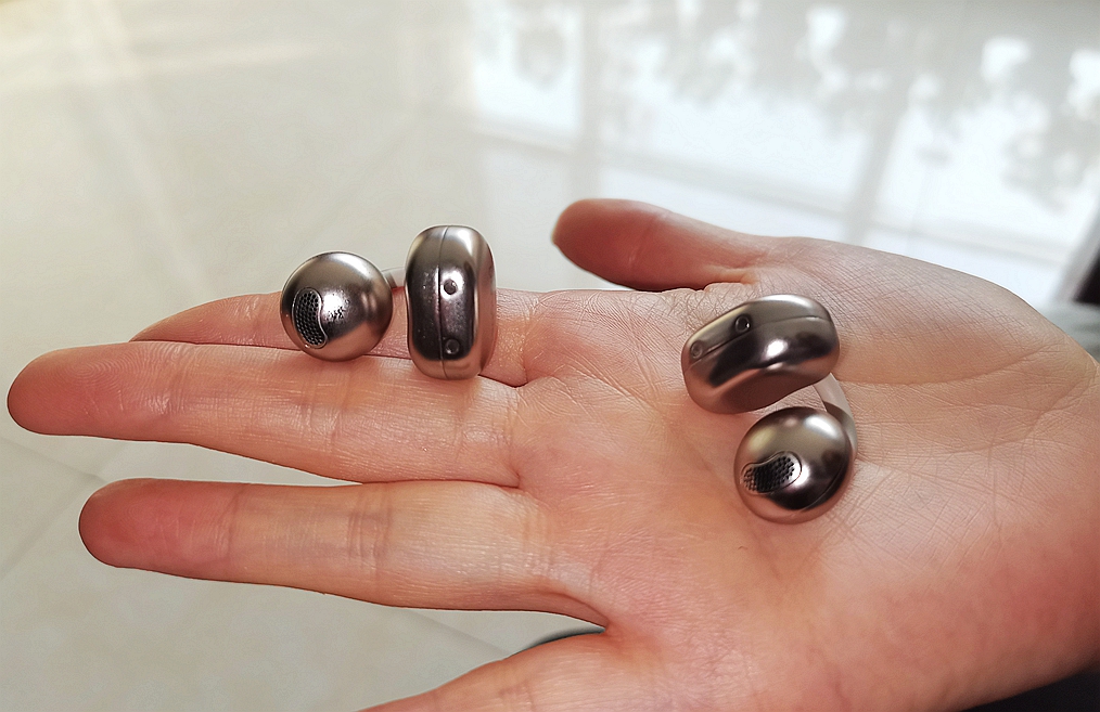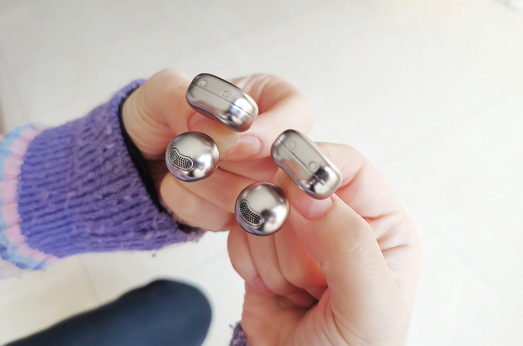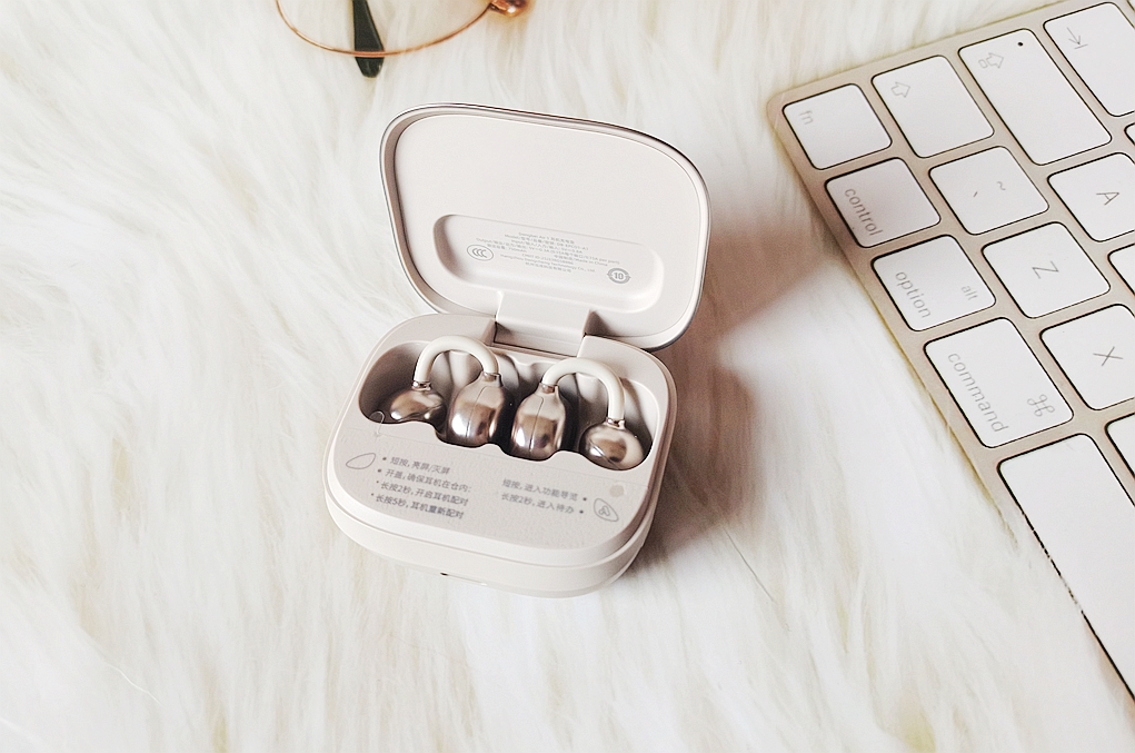 耳夹耳机同样采用磨砂质感,搭配云弧耳夹设计,线条流畅精致,单耳重量只有6.1g,比1元硬币还要轻,拿在手里几乎感受不到重量,而且颜值设计方面也很精致,让人又一种拿到就想佩戴的期待。细节处理也很到位,出音口位置精准,云感豆和亲肤硅胶材质触感柔软,没有任何毛刺,能看出品控很用心。