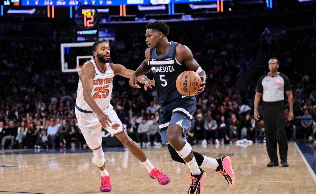 森林狼队首发:安东尼-爱德华兹、朱利叶斯-兰德尔、贾登-麦克丹尼尔斯、鲁迪-戈贝尔、丹特-迪文琴佐