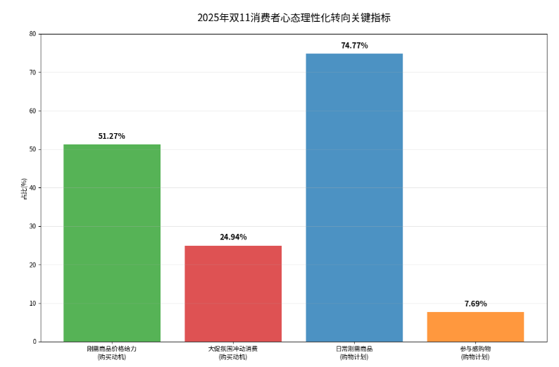 第四章:消费者行为变迁与市场分化4.1 消费心态与决策路径的理性化转向2025年双11期间,消费者心态呈现出明显的理性化转向。根据调研数据,消费者的购买动机呈现出明显的理性化特征:51.27%的用户因“刚需商品价格给力”而购买,仅24.94%承认受“大促氛围”影响冲动消费。在购物计划方面,74.77%的首单消费者购买的是“日常刚需商品”,仅7.69%因“参与感”购物。这种“需要什么买什么,需要多少买多少”的态度,取代了以往“必须凑满多少额度”的思维模式,反映出消费者对双11的期待值和行为模式发生了根本性变化。