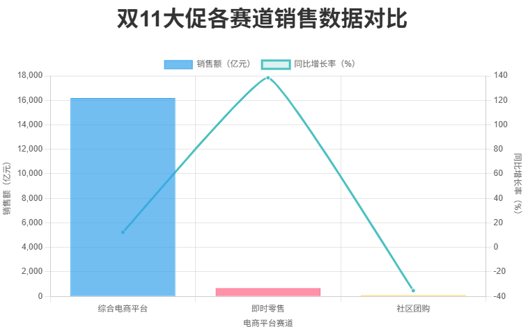 本次双11大促周期从10月7日持续至11月11日,覆盖天猫、京东、拼多多、抖音、快手等主流电商平台。其中,综合电商平台销售额为16191亿元,同比增长12.3%;而即时零售赛道表现尤为亮眼,全渠道销售额达670亿元,同比激增138.4%,成为最具爆发力的新增长极。社区团购则出现下滑,销售额为90亿元,同比下降35.3%。